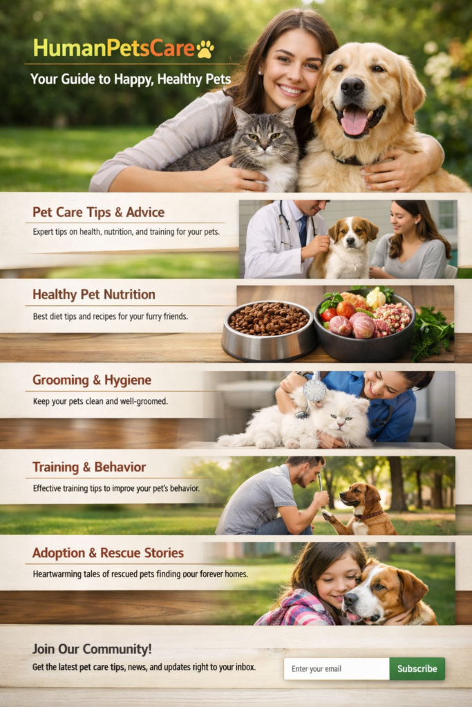 At HumanPetsCare, we believe pets are not just animals—they are family. Our mission is to provide trusted, compassionate, and science‑backed pet care information that helps pet parents give their dogs, cats, and other companions a healthier, happier life. From daily nutrition and grooming to disease prevention and emotional well‑being, HumanPetsCare is your complete online guide for responsible pet ownership.