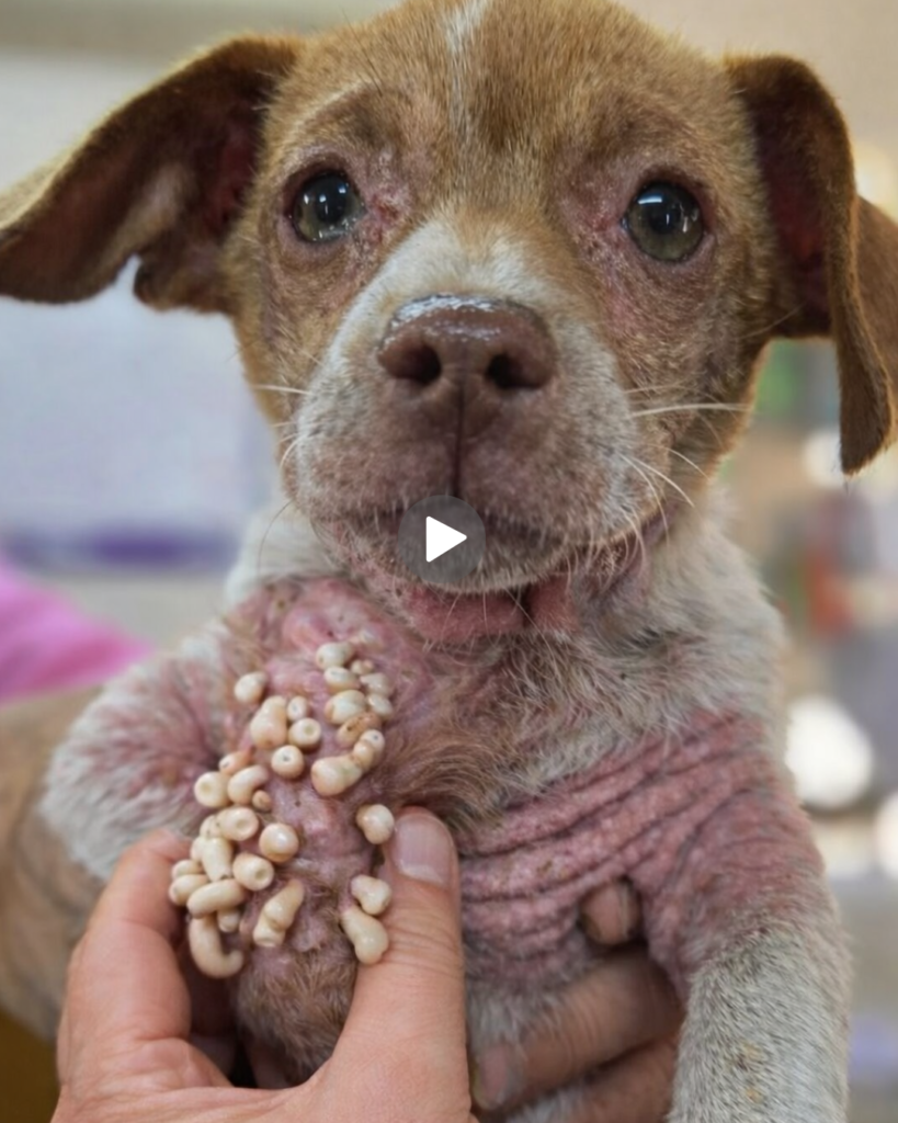 The image of this small dog is both heartbreaking and powerful. At first glance, we see a young puppy with gentle eyes, looking directly at the camera as if trying to communicate something deeper than words. But as our attention moves beyond the face, the harsh reality of the dog’s condition becomes impossible to ignore. The dog’s body shows severe skin damage, hair loss, inflammation, and visible parasites clustered around its neck and chest. This image is not just about one dog—it represents the suffering of countless stray and neglected animals around the world.